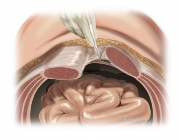 Zweiter Schritt ist die Freipräparation des retromuskulären Raums. Dafür wird die hintere Rektusscheide visualisiert und medialseits  möglichst nah am Faszienrand der Bruchlücke längs inzidiert.  Anschließend stumpfes Ablösen der Rektusmuskeln von den hinteren Blättern der Rektusscheide. Nach lateral wird die Präparation bis zum Erreichen der neurovaskulären Bündel fortgeführt. Diese müssen unbedingt geschont werden und stellen die laterale Grenze der Präparation dar.